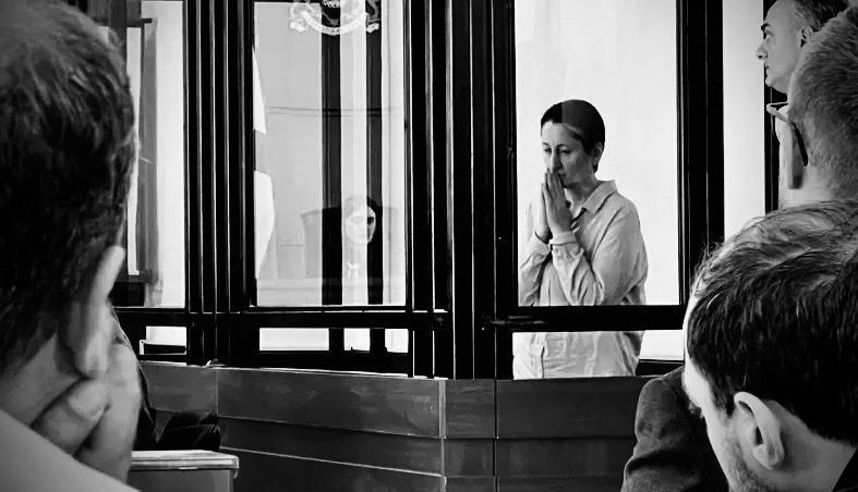 In Mzia Amaghlobeli’s case as well, she is confined inside a special glass enclosure, contributing further to her portrayal as a dangerous criminal in the public eye.